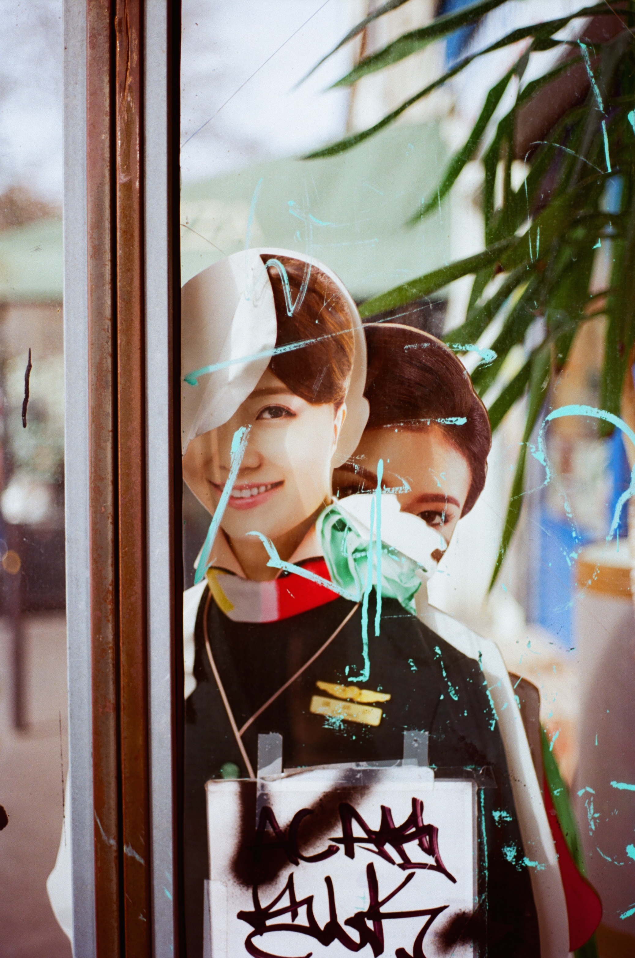 observe de manière amusée les images visibles dans les devantures des magasins, à l’intérieur des petites